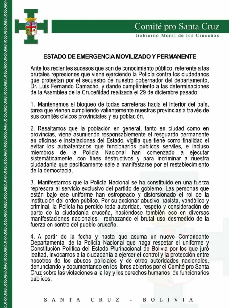 🔵 #ANF I El @ComiteProSC, «en cumplimiento a las determinaciones de la Asamblea de la Cruceñidad», resolvió mantener los bloqueos en las carreteras, el resguardo permanente de las instituciones públicas, entre otros puntos. https://t.co/bgPZf6gdMt