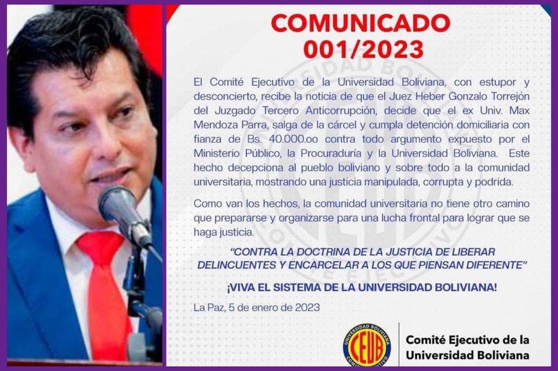 “Estupor y desconcierto”. Anuncian la salida de la cárcel de Max Mendoza y el Comité Ejecutivo de la Universidad Boliviana se declara “decepcionado” y anuncia “lucha frontal”
