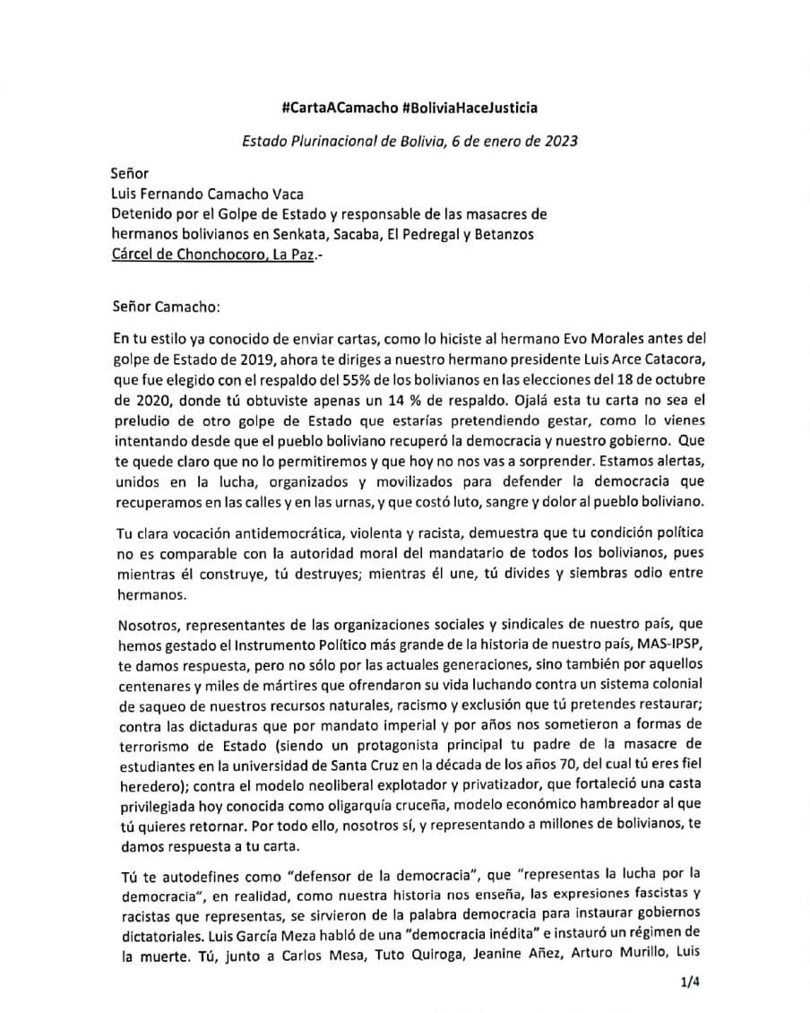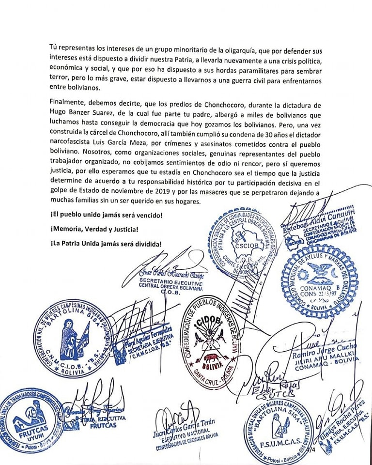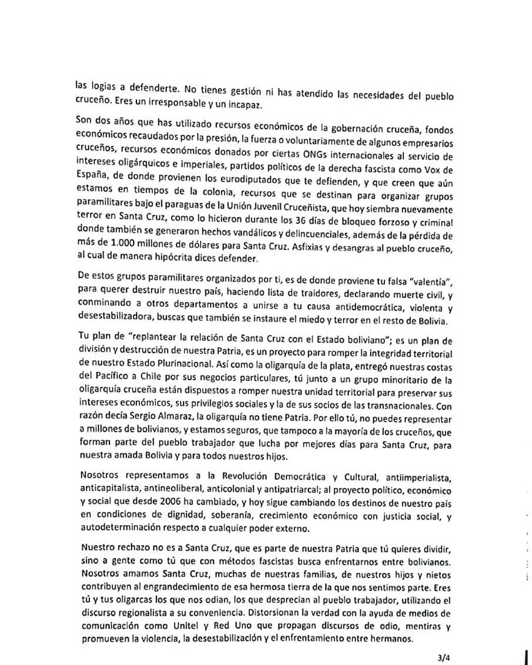 Organizaciones sociales le envían una carta al Gobernador Luis Fernando Camacho y lo acusan de querer dividir Bolivia.