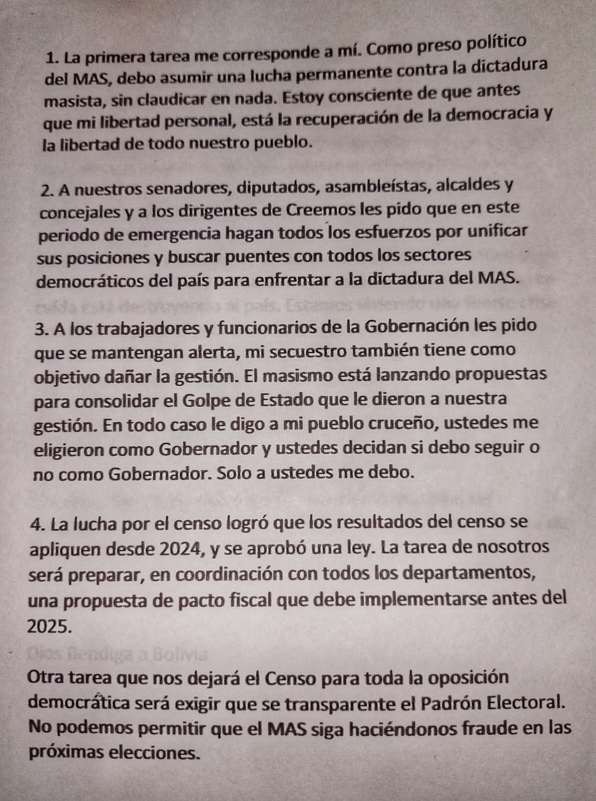 En esta lucha por una Bolivia libre y sin dictadura del MAS, todos tenemos tareas que cumplir. Voy a enumerar algunas tareas que cumplir: