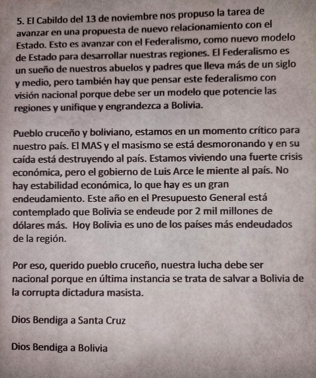 Por eso, querido pueblo cruceño, nuestra lucha debe ser nacional porque en última instancia se trata de salvar a Bolivia de la corrupta dictadura masista.