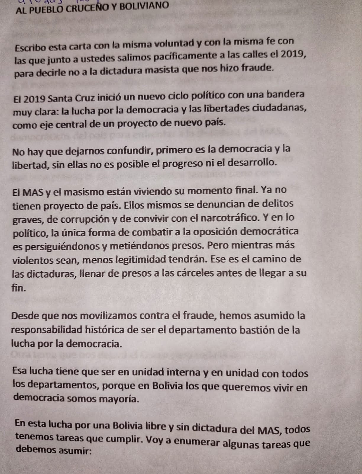 Escribo esta carta con la misma voluntad y con la misma fe con las que junto a ustedes salimos pacíficamente a las calles el 2019, para decirle no a la dictadura masista que nos hizo fraude.
