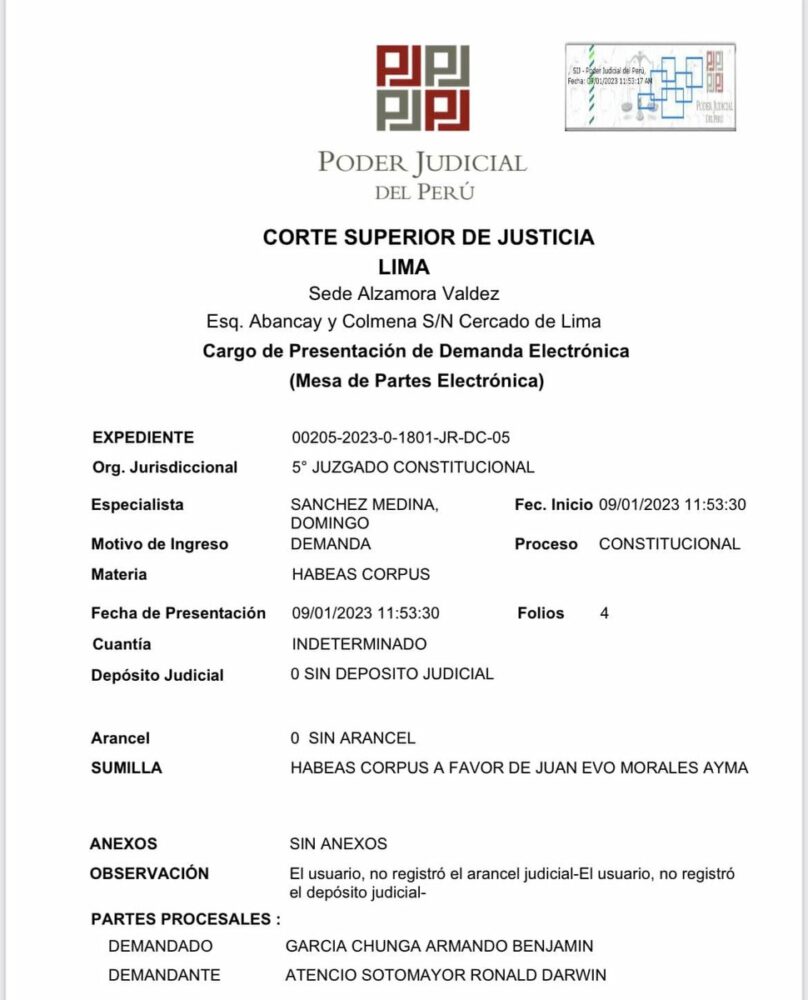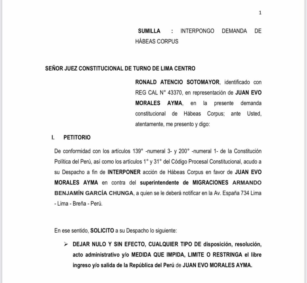 🔵 #ANF I Ronald Atencio, exabogado del expresidente de Perú, Pedro Castillo, interpuso una demanda de habeas corpus en favor de Evo Morales para que pueda transitar libremente por territorio peruano tras que Migraciones prohibiera su ingreso a ese país. https://t.co/tQUoQjld7B
