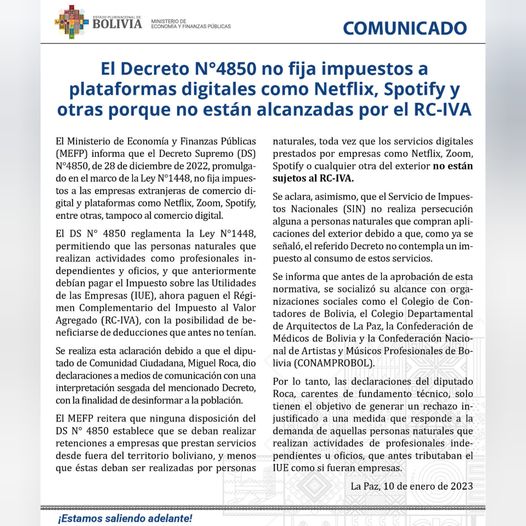 #COMUNICADO Min. de Economia y Finanzas Públicas: El Decreto Suoremo 4850 no fija impuestos a plataformas digitales como Netflix, Spotify y otras porque no están alcanzadas por el RC – IVA.