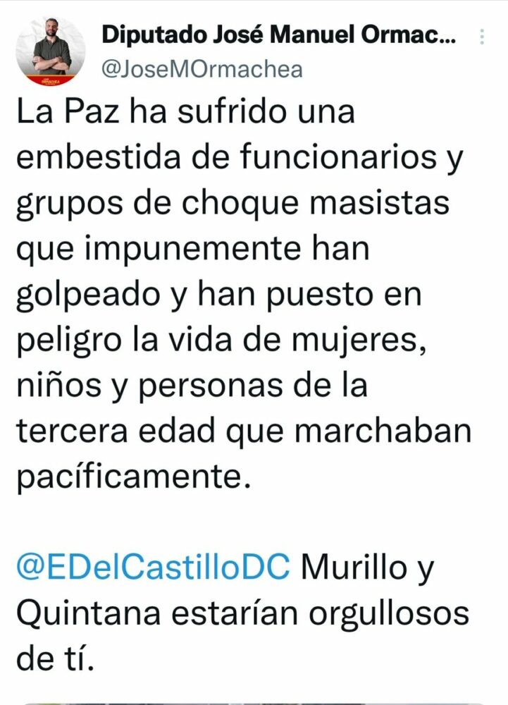 🔵 #ANF | El diputado de CC, José Manuel Ormachea, acusó a funcionarios públicos y a grupos de choque del MAS por agredir a manifestantes en la ciudad de #LaPaz. «Han puesto en peligro la vida de mujeres, niños y personas de la tercera edad que marchaban pacíficamente», tuiteó. https://t.co/1j3EPOa4Zb