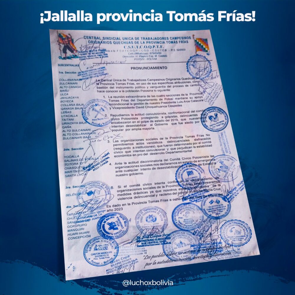 La Central Sindical Única de Trabajadores Campesinos Originarios Quechuas de la Provincia Tomás Frías, #Potosí, siempre fue, es y será bastión de nuestro Instrumento Político y vanguardia del Proceso de Cambio. Muchas gracias por su respaldo, no nos sentimos solos. https://t.co/kHsKRyKCUL