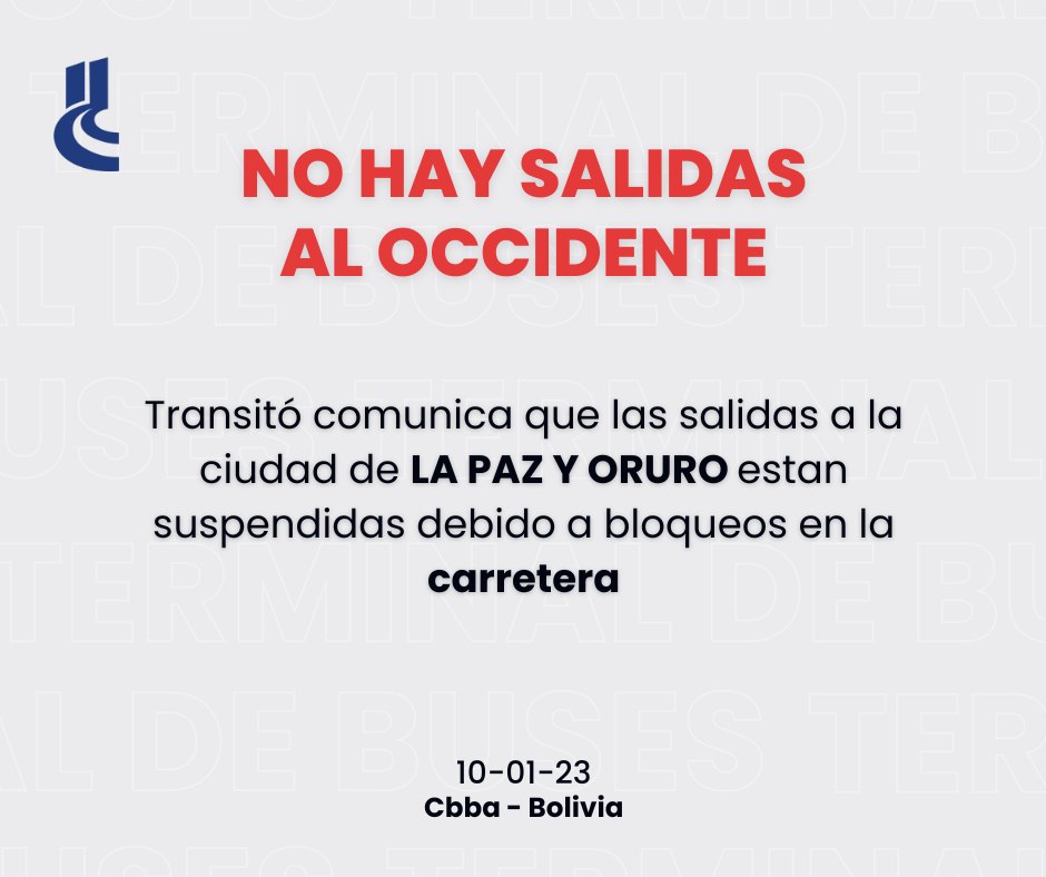 🔵 #ANF | La Terminal de buses de #Cochabamba informó que las salidas a los departamentos de #LaPaz y #Oruro quedan suspendidas debido a un bloqueo de comunarios en la localidad de Caihuasi. https://t.co/MobFYeym9Z