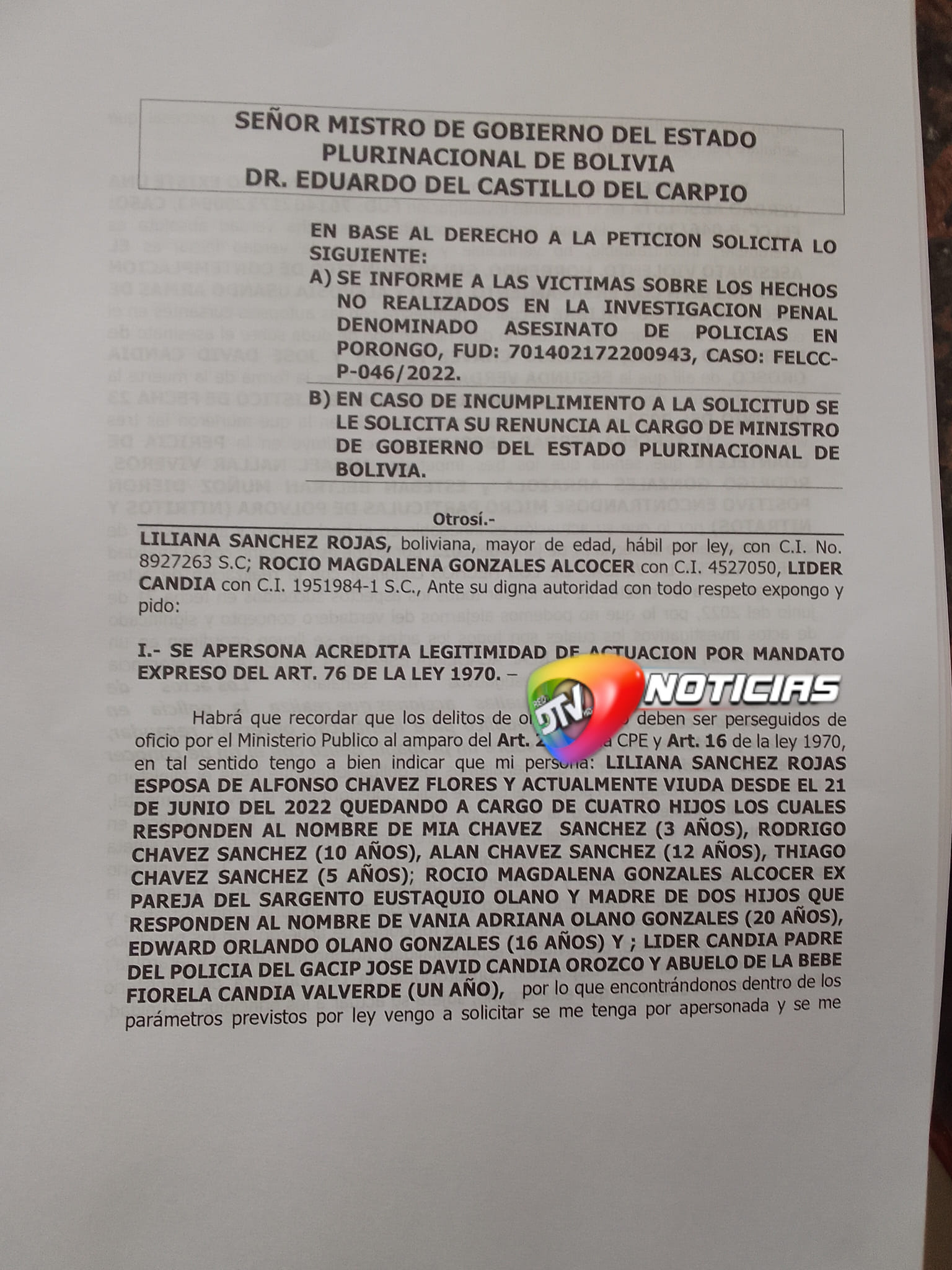 La defensa de los dos uniformados y un funcionario del Gacip victimados en junio del 2022, llegó a la sede de Gobierno desde Santa Cruz y a través de un memorial piden la renuncia del ministro de Gobierno Eduardo Del Castillo, dicen que existe un proteccionismo a efectivos de inteligencia y el proceso como tal no avanza, es más hablan de un amparo de no ser escuchados, aprehensión de Camacho fue una distracción para desviar el tema asegura el jurista.