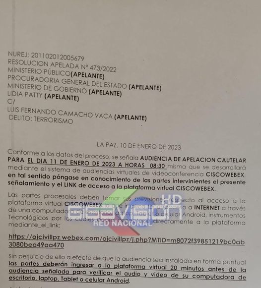 Éste miércoles a las 8:30 de la mañana la sala penal 2da de la paz resolverá la apelación del gobernador Luis Fernando Camacho a los 4 meses de detención preventiva en el denominado caso «Golpe l», y mientras su defensa buscará revocar la resolución del juez 8vo cautelar, la procuraduria, fiscalia, ex diputada Lidia Patty y el ministerio de gobierno también apelaron y buscan ampliar a 6 meses la detención de la autoridad en Chonchocoro, los 5 recursos se resuelven en la misma audiencia virtual éste 11 de enero de 2023.