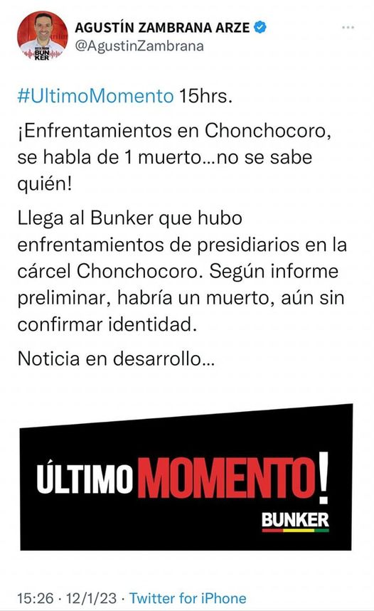Advierte sobre enfrentamientos en la cárcel de Chonchocoro.