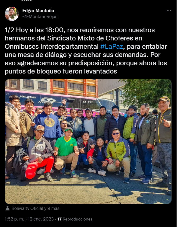 🔵 #ANF | El ministro de Obras Públicas, Edgar Montaño, a través de Twitter, informó que hoy por la tarde se reunirá con los choferes sindicalizados para escuchar sus demandas. Agradeció al sector por la suspensión de los bloqueo en vías de la ciudad de #LaPaz. https://t.co/p4uzoQN83v