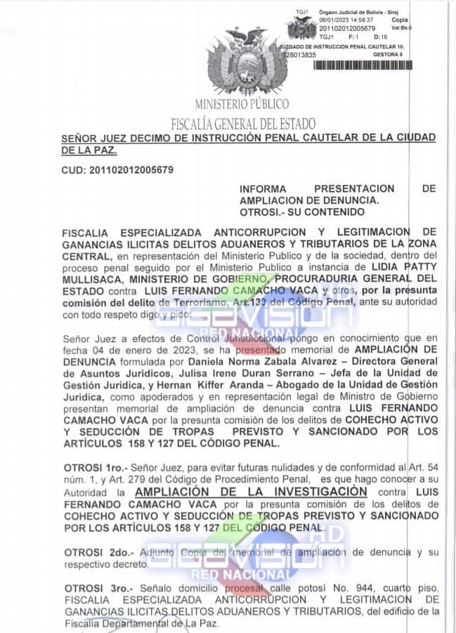 🔵 #ANF | En el marco de la investigación por el caso "Golpe I", el Ministerio Público amplió la denuncia del ministerio de Gobierno contra el gobernador de #SantaCruz por los supuestos delitos de seducción de tropas y cohecho activo. (Vía: Gigavisión) pic.twitter.com/vP9pP52rPY