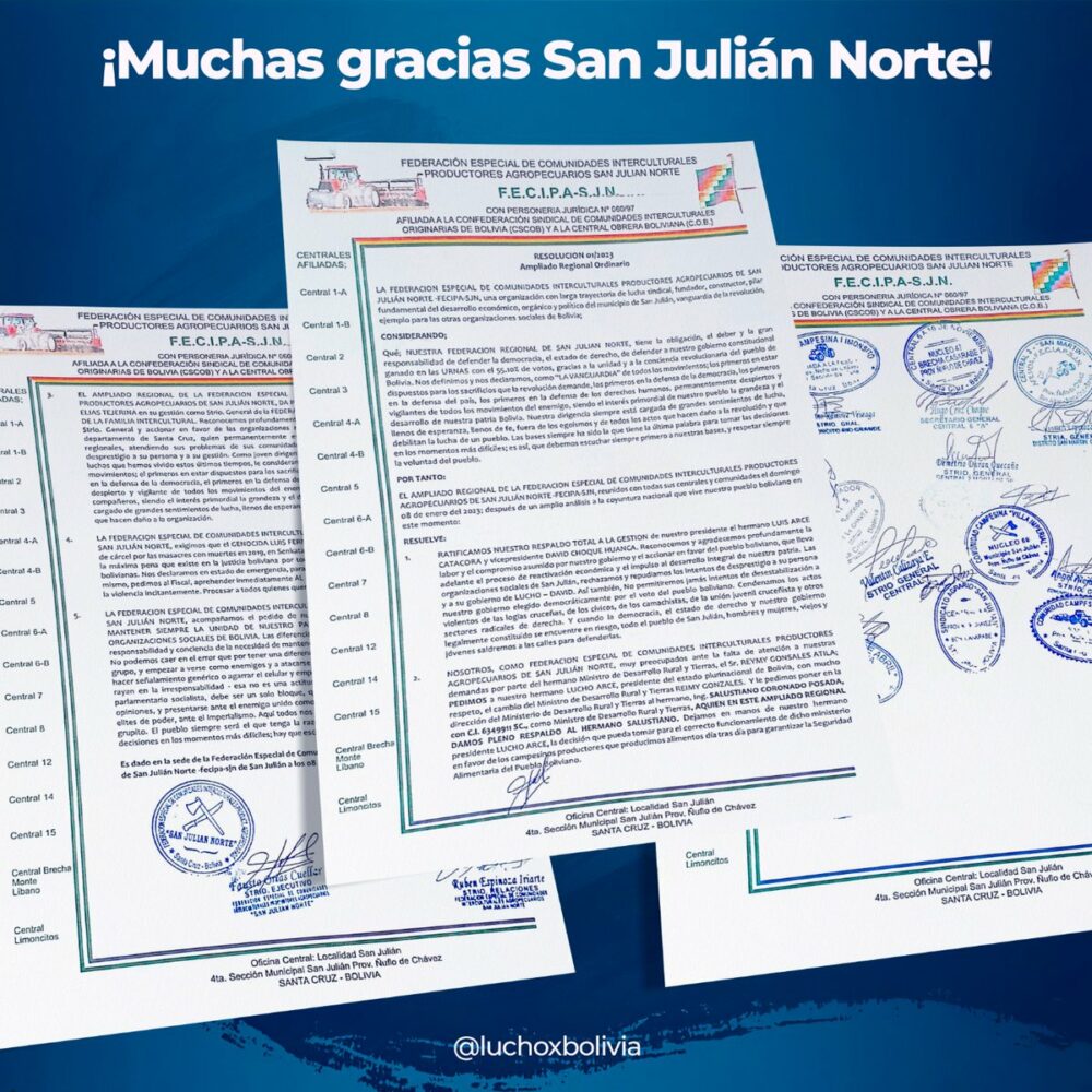 No nos cansaremos de agradecer el respaldo de las organizaciones sociales porque nuestro Proceso de Cambio le pertenece al pueblo boliviano. Gracias hermanas y hermanos de la Federación Especial de Comunidades Interculturales Productores Agropecuarios San Julián Norte, #SantaCruz https://t.co/LBjmmMqTPw