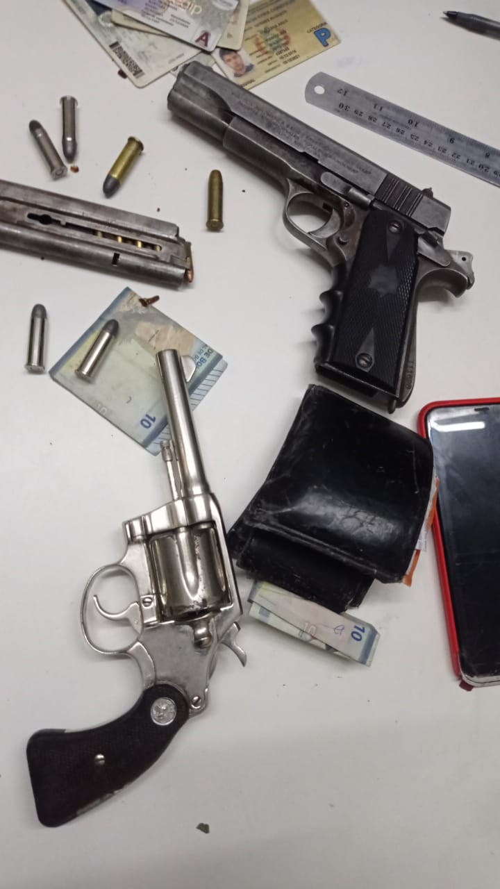 La policía de Cotoca aprehendió este sábado a dos personas que circulaban en una motocicleta cerca del surtidor Gasómetro, al notar presencia policial intentaron escapar pero fueron alcanzados por la policía, se les encontró un arma calibre 9 milímetro y otra calibre 38.