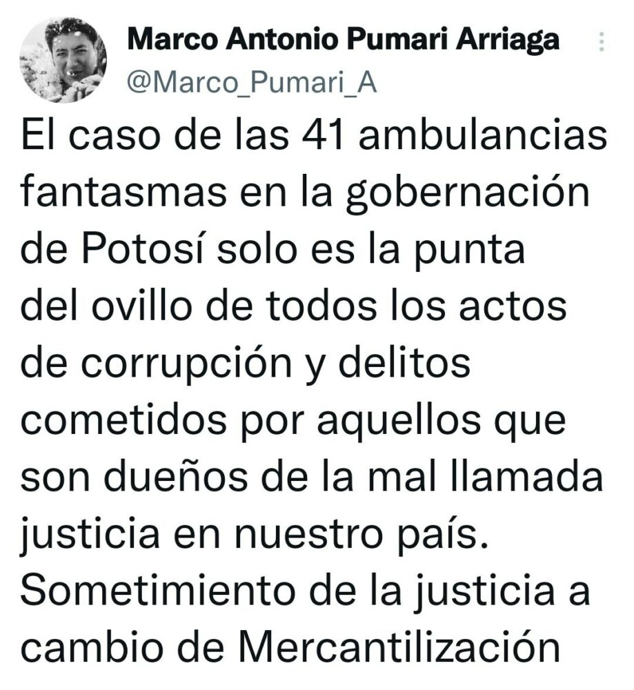 🔵 #ANF | Marco Antonio Pumari asegura que el caso de las 41 ambulancias fantasmas en la gobernación de Potosí «solo es la punta del ovillo de todos los actos de corrupción» y que el gobernador de Potosí, Jhonny Mamani, «debería estar en la cárcel». https://t.co/EqR37M4A8Q