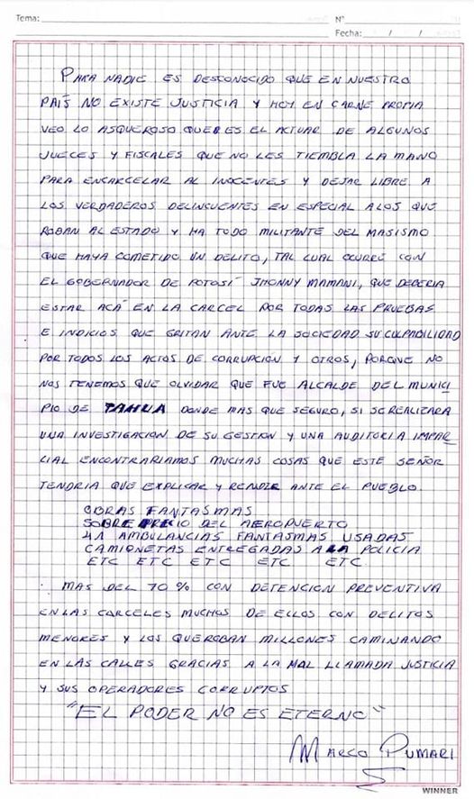 Pumari a través de una carta señala que «el Gobernador de Potosí, Jhonny Mamani, debería estar en la cárcel»