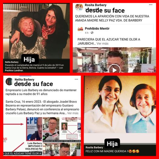 Primero fueron las nietas desde sus redes, después los nietos en la justicia y ahora las hijas de Nelly Paz viuda de Barbery que le reclaman a sus hermanos Ana Karen y a Luis Barbery (presidente de los Empresarios Privados de Bolivia) por «la desaparición» de su madre.