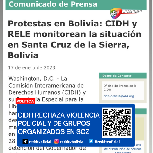 CIDH y su Relatoría Especial para la Libertad de Expresión RELE, expresó su rechazo al uso excesivo de la fuerza por parte de la Policía y los actos de violencia cometidos por grupos organizados en Santa Cruz, durante las protestas tras la aprehensión de Luis Fernando Camacho