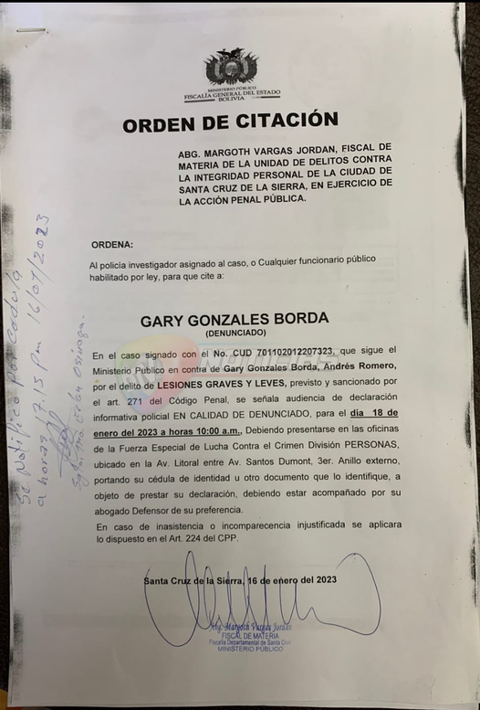 «Hoy la cita es por la democracia, por la libertad, la injusticia. 10 am me toca declarar por ese millon y medio de personas cruceñas que asistimos a un cabildo, por ese 70% de todos bolivianos que piensan diferente a este Gobierno Dictatorial.