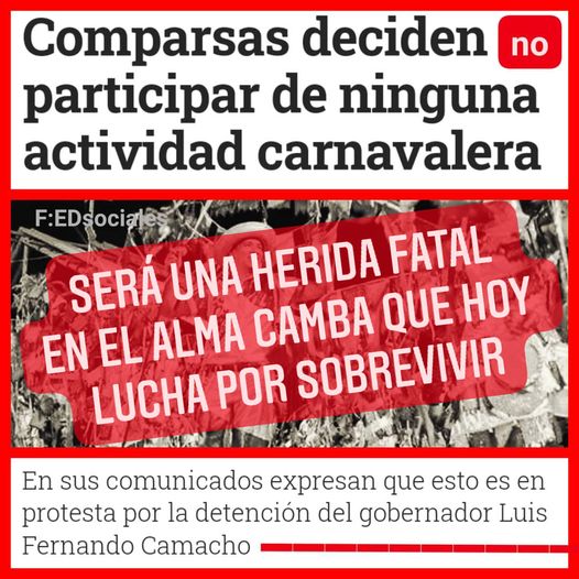 ¡Que no muera Santa Cruz! Hoy estará herida y maltratada. Pero sabemos que, si alguna vez la matan, resucita en Carnaval. Que viva el Carnaval. Que viva Santa Cruz.