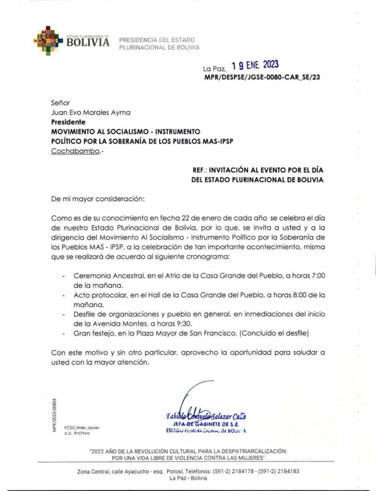 🔵 #ANF | El MAS informó que la jefa de Gabinete del ministerio de la Presidencia envió una invitación por WhatsApp a Evo Morales para participar del acto por el Día del Estado Plurinacional. La dirigencia del partido de gobierno "rechazó esta falta de respeto" a su líder. pic.twitter.com/GRKS8dSQF6