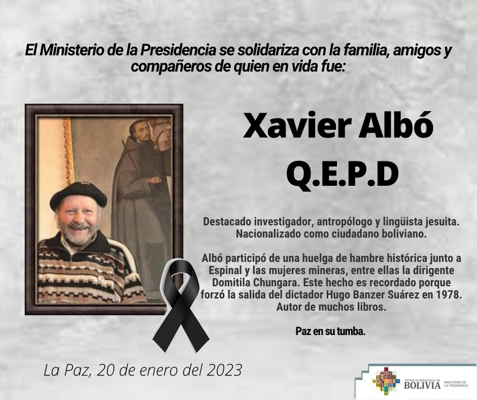 🔵 #ANF | Instituciones académicas, culturales y gubernamentales rindieron un homenaje póstumo al sacerdote jesuita Xavier Albó por su enorme contribución al país. pic.twitter.com/u2wgPPAicU