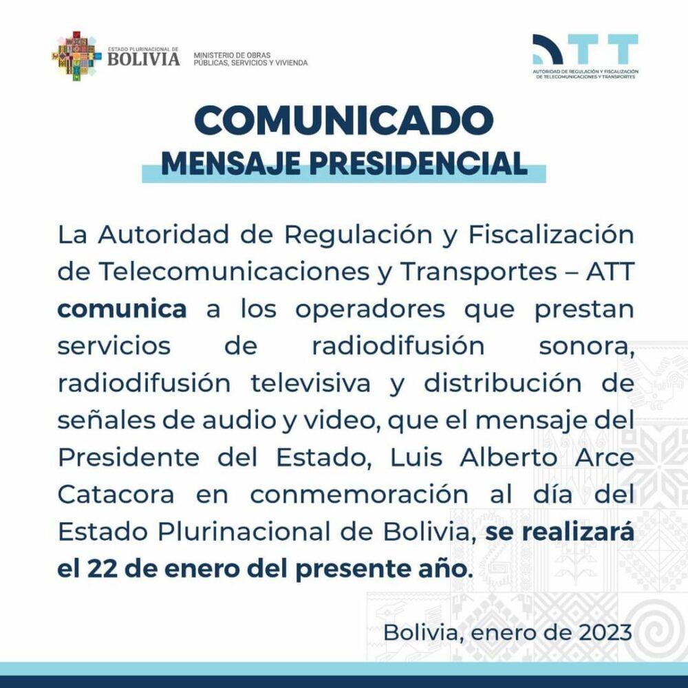 🔵 #ANF | La ATT recuerda a todos los operadores que prestan servicios de radiodifusión sonora/televisiva y distribución de señales de audio y video que el presidente Luis Arce emitirá su discurso el domingo 22 de enero por el Día del Estado Plurinacional. pic.twitter.com/SlnRMsI0vX