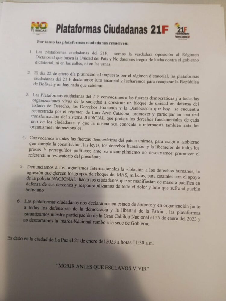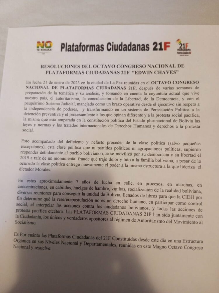🔵#ANF | #Política Esta es la resolución del octavo congreso de las Plataformas Ciudadanas del #21F, que se realizó en La Paz. Exigen la liberación de los presos políticos, impulsar el revocatorio de @LuchoXBolivia y confirman asistencia al Cabildo Nacional. pic.twitter.com/JN6FOYSYSW