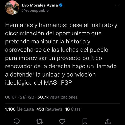 Evo Morales Ayma denuncia “discriminación y maltrato de los renovadores” por invitarlo a “ultimo momento” a los festejos por los 14 años del estado plurinacional.