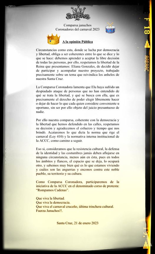Ante la decisión asumida por S.M. 👑Elu Gonzalez -Reina del pueblo y de los corazones cruceños- la comparsa Januchos 🎉anuncia de la designación de una ¿nueva? representante del carnaval.