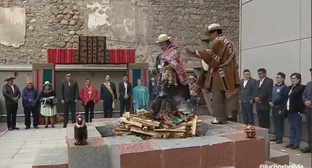 🔵#ANF | #Política Con un ritual ancestral comenzaron los actos de celebración del Día del Estado Plurinacional de #Bolivia. Ministros, asambleístas del MAS y dirigentes del Pacto de unidad participan.