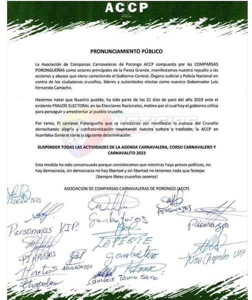 A través de un comunicado, la asociación de comparsas carnavaleras de Porongo, suspenden todas las actividades carnavaleras, corso y carnavalito