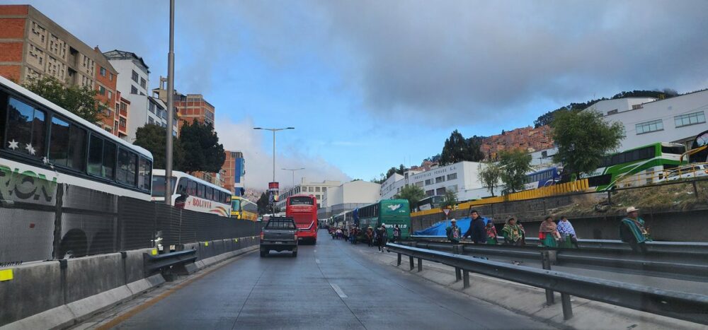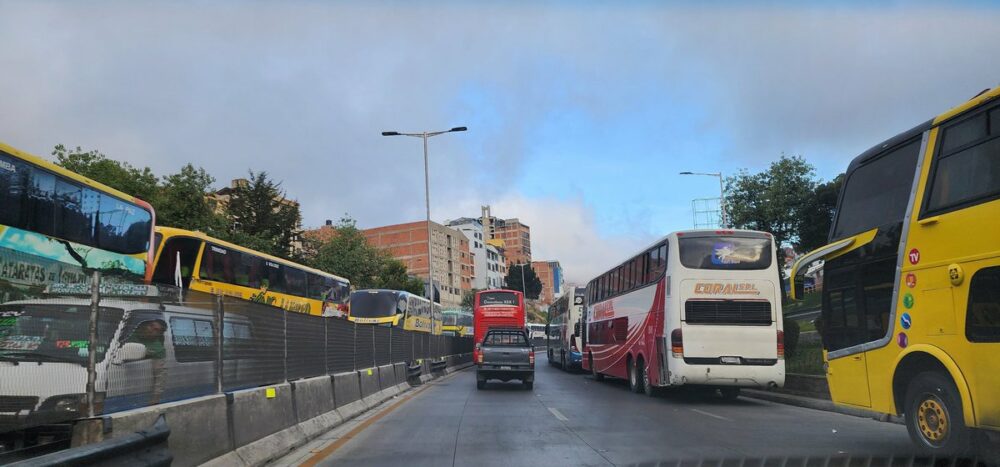 🔵#ANF | #Sociedad Se registran largas filas de buses del servicio interdepartamental en la Autopista La Paz – El Alto, a la altura de la Cervecería Boliviana Nacional (CBN). El carril de bajada está colapsado y dificulta la circulación vehicular.