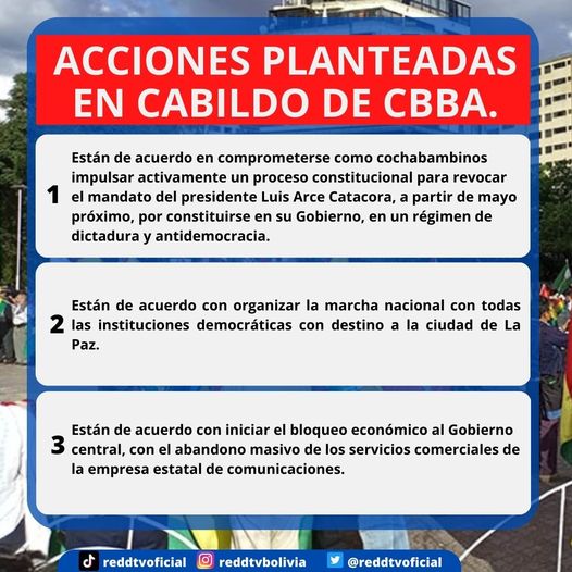 3 acciones fueron planteadas y aprobadas en Cochabamba, durante el Cabildo Nacional por la libertad y democracia.Categorías NoticiasEtiquetas , Detrás de la Verdad, DTV, Facebook 25/01/2023 [vid_embed] Fuente: DTV => Recibir por Whatsapp las noticias destacadas