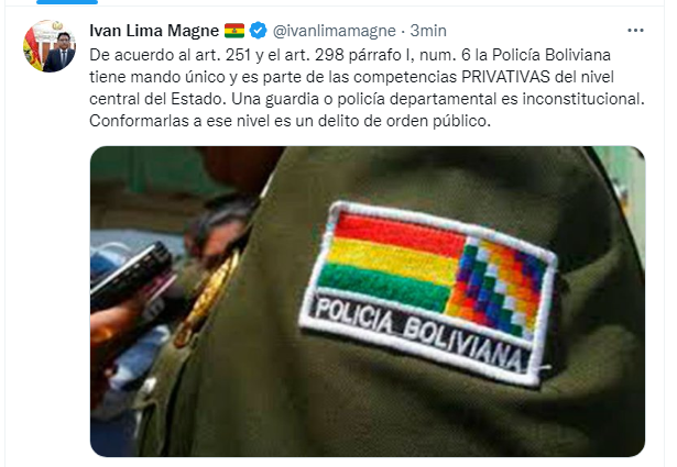 🔵 #Ultimo | El ministro de Justicia, Iván Lima, cuestiona el planteamiento que hizo el presidente del Comité Cívico Pro #SantaCruz durante el cabildo cruceño sobre la creación de una guardia departamental. "Conformarlas a ese nivel es un delito de orden público", tuiteó. pic.twitter.com/tbmEre8rle