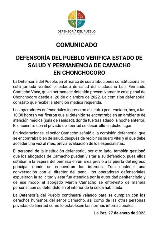 La Defensoría del Pueblo, esta jornada verificó el estado de salud del Gobernador Luis Fernando Camacho, quien se encuentra recluido preventivamente en el penal de Chonchocoro desde el 28 de diciembre de 2022. La comisión defensorial constató que recibe la atención médica requerida. En declaraciones, el señor Camacho señaló a la comisión defensorial que se encontraba bien de salud, después de recibir su suero vital y al que debe acceder una vez al mes, previa evaluación de los especialistas.