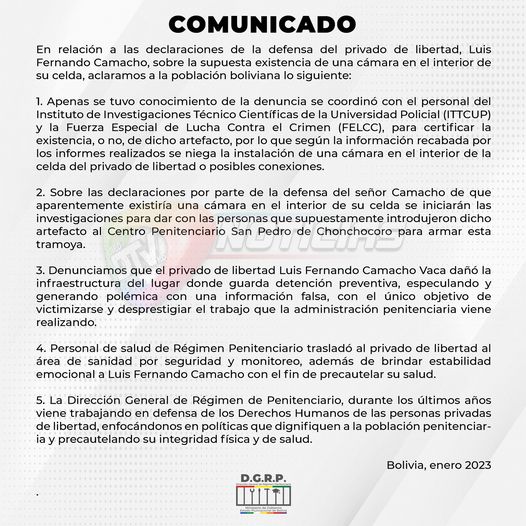 Dirección General de Régimen Penitenciario, emite comunicado por denuncia del gobernador Luis Fernando Camacho de «Cámara espía» en su celda