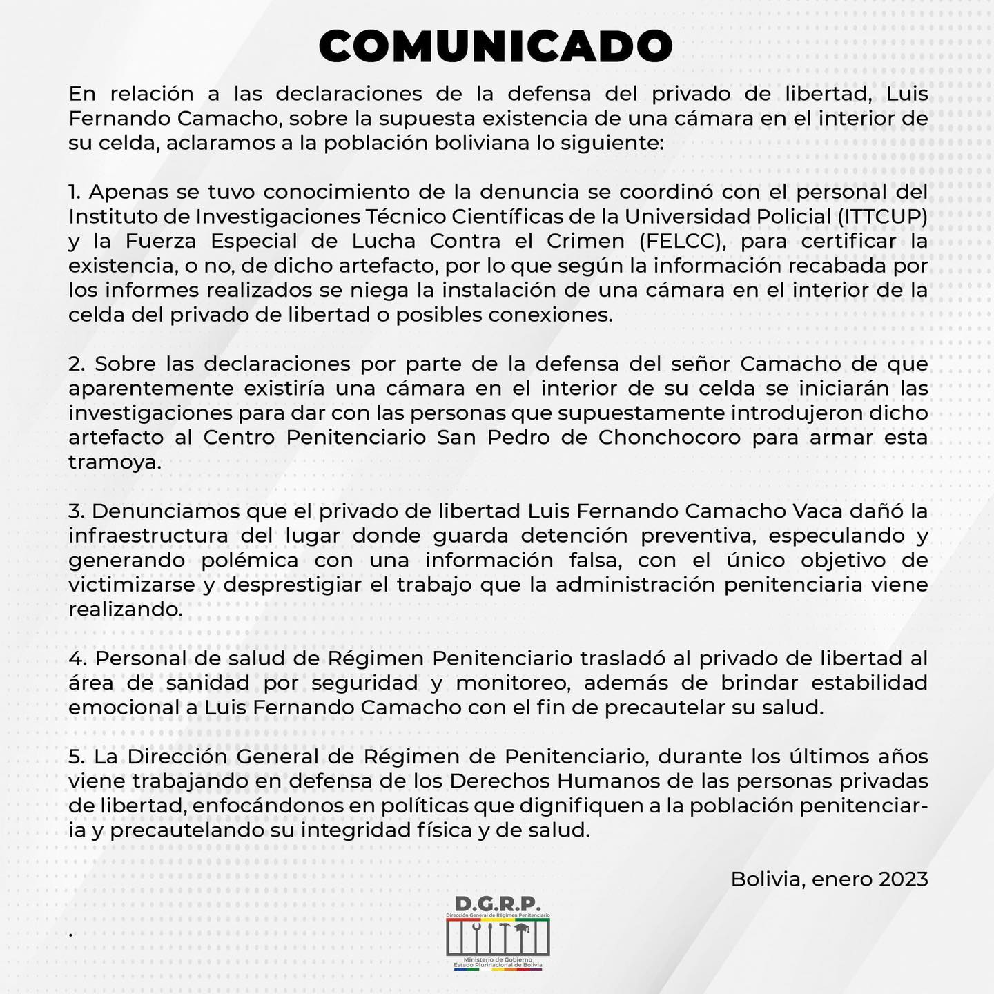 Régimen Penitenciario, niega la existencia de la cámara espía en la celda de Camacho.