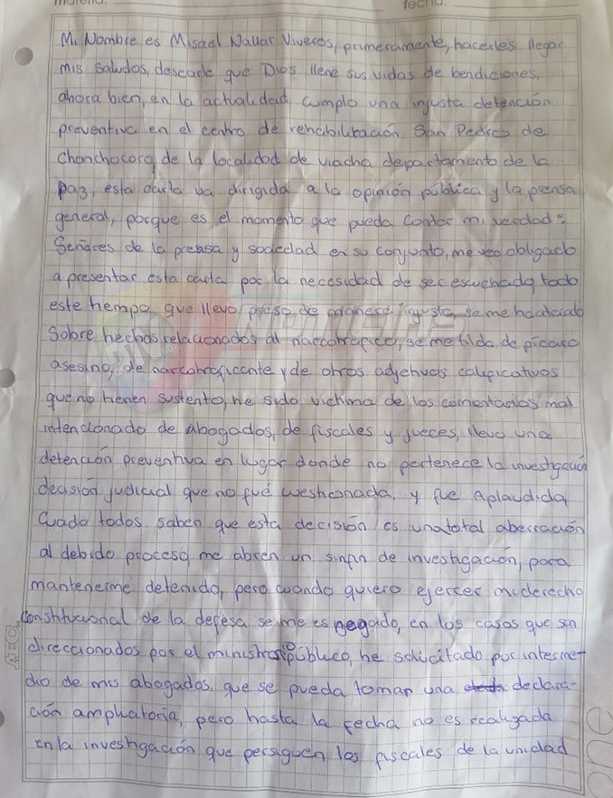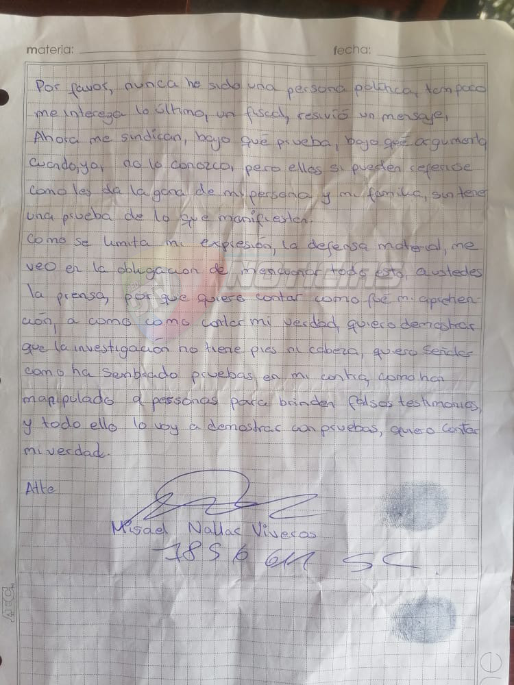 Nallar manda una carta dirigida a la opinión pública y a la prensa, en la cual se declara inocente de todos los hechos que se lo relaciona.