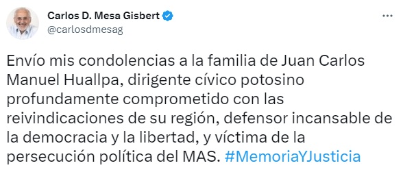 #ANF El expresidente Carlos Mesa expresa sus condolencias por la muerte del dirigente cívico Juan Carlos Manuel. Agrega que fue víctima de la «persecución política del MAS». https://t.co/HNNoV2P5bj