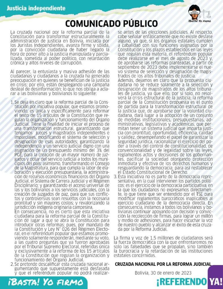 🔵 #ANF | Juristas independientes denuncian una campaña de desinformación contra la recolección de firmas para reformar la justicia vía referendo. Aclaran que es solo «para reformar el texto de 15 art. de la CPE que regulan la organización y funcionamiento del Órgano Judicial». https://t.co/jF0LtNRMyS