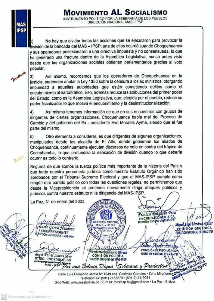 🔵#ANF La dirección nacional del MAS denuncia ataques de parte de la vicepresidencia del Estado "con el objetivo de proscribir al partido y a su dirigencia". "Choquehuanca habla mal del proceso de cambio y de Evo Morales", cita un comunicado publicado desde su cuenta de Facebook. pic.twitter.com/9N6UZw3mS2