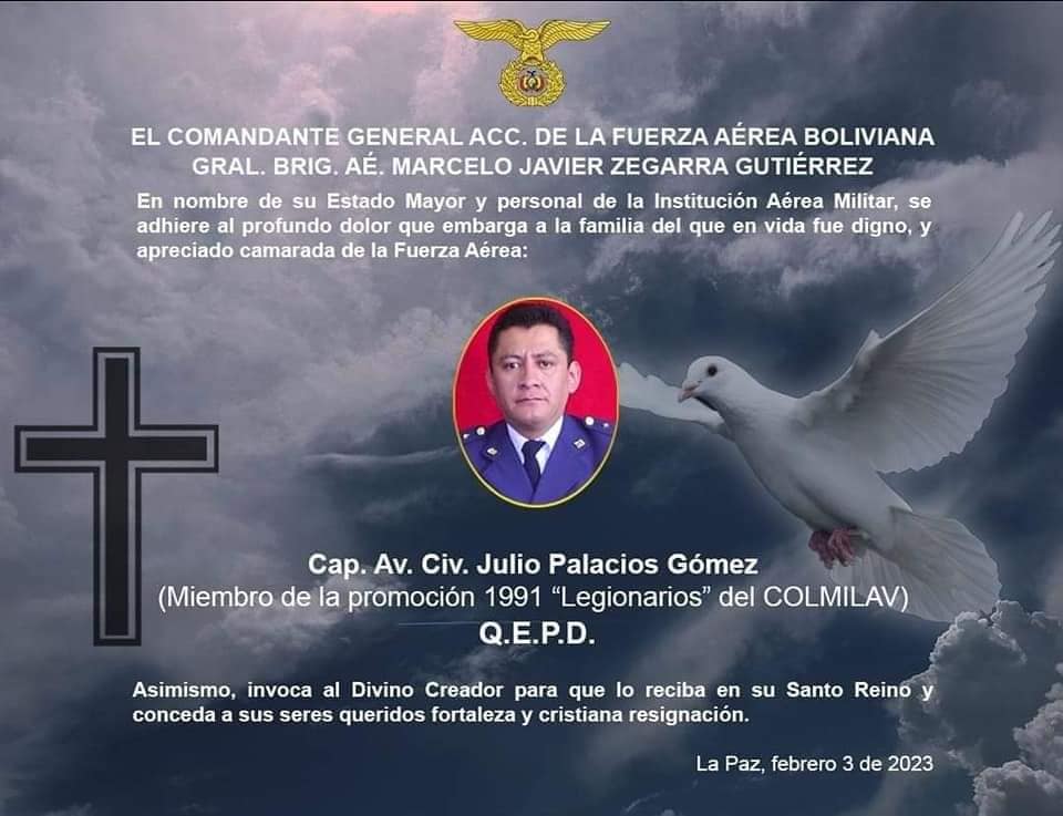 “El Gobierno del Estado Plurinacional de Bolivia expresa sus más sinceras condolencias por la irreparable pérdida del piloto boliviano Julio Antonio Palacios Gómez, quien prestaba servicios a la Corporación Nacional Forestal (CONAF) de la República de Chile. Palacios trabajaba en el combate a los incendios que azotan a las regiones de Maule, Araucanía, Ñuble, Biobío, entre otros, de la República de Chile, y que están ocasionando graves daños materiales además de la pérdida de vidas humanas. Expresamos nuestra solidaridad con el gobierno y pueblos de la República de Chile a quienes reiteramos nuestro firme compromiso en apoyar y acompañar estos momentos difíciles”, indica el comunicado de la Cancillería.