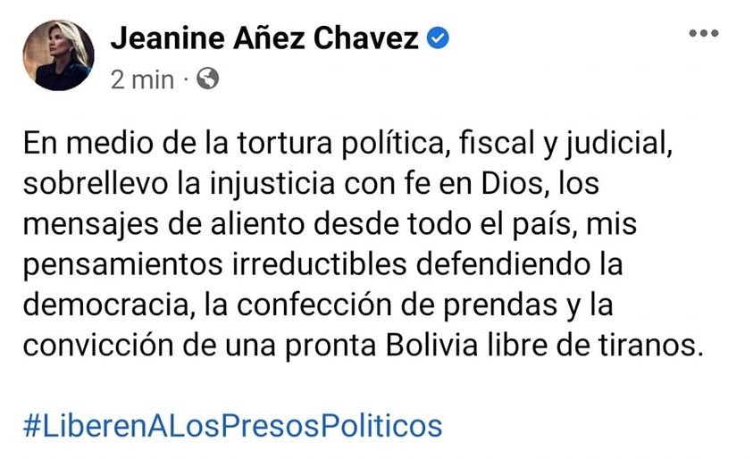 Añez señala que sobrelleva «la injusticia con fe en Dios»