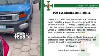 Comité Civico Pro Santa Cruz respalda a su gerente después del impase que tubo con algunas perdonas fuera del ente cívico el fin de semana.