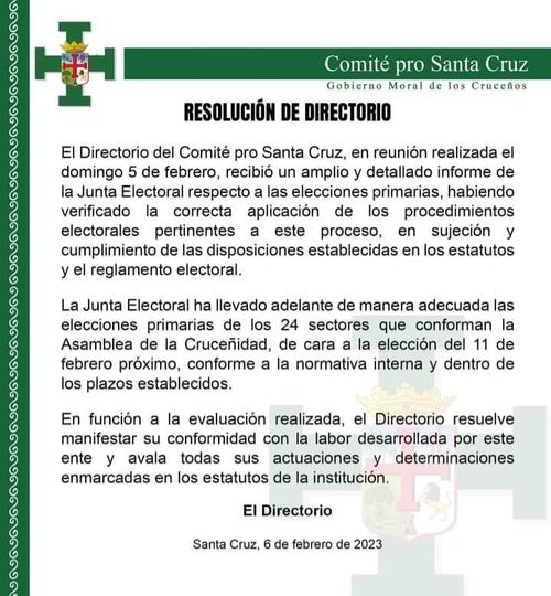 Comité Civico respalda decisiones de la Junta Electoral, tras la polémica que se generó a raíz de la inhabilitación de Reinerio Vargas y sus acompañantes de fórmula, el ente cívico emitió una resolución de directorio, donde añade que avala todo su actuar.