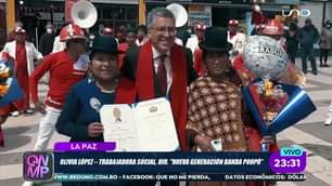 #LaPaz | La flamante graduada Olivia López Machaca, se tituló este martes como licenciada en Trabajo Social de la Universidad Mayor de San Andrés (UMSA), los integrantes de su banda le brindaron un abrazo musical.
