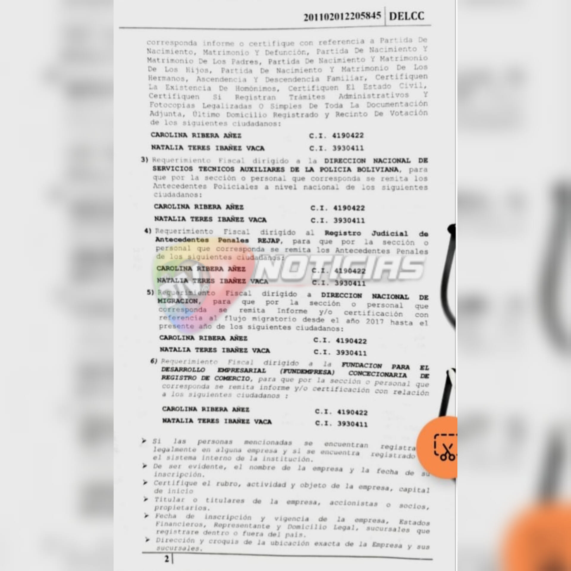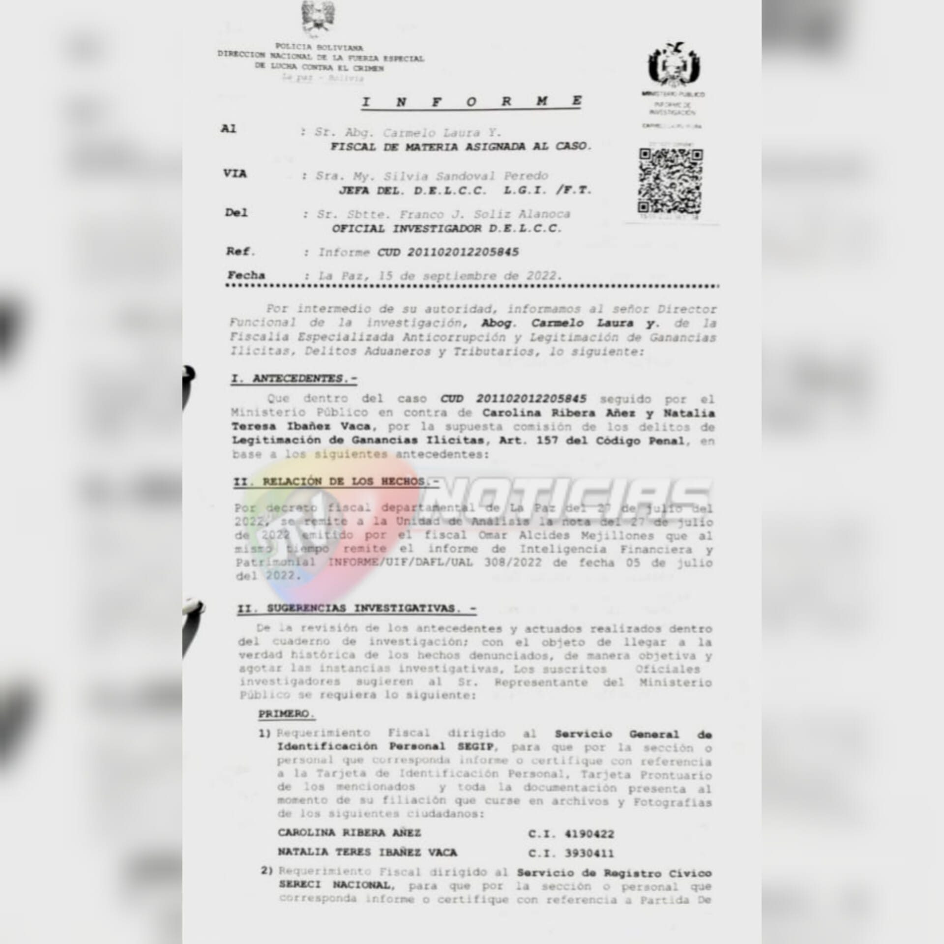 En el documento al que accedió la RED DTV, se observa que la Fiscalía investiga a Carolina Ribera, hija de la expresidente Jeanine Añez, por la presunta comisión del delito de legitimación de ganancias ilícitas. En ese marco, solicitan informes a 32 entidades, entre públicas y privadas.