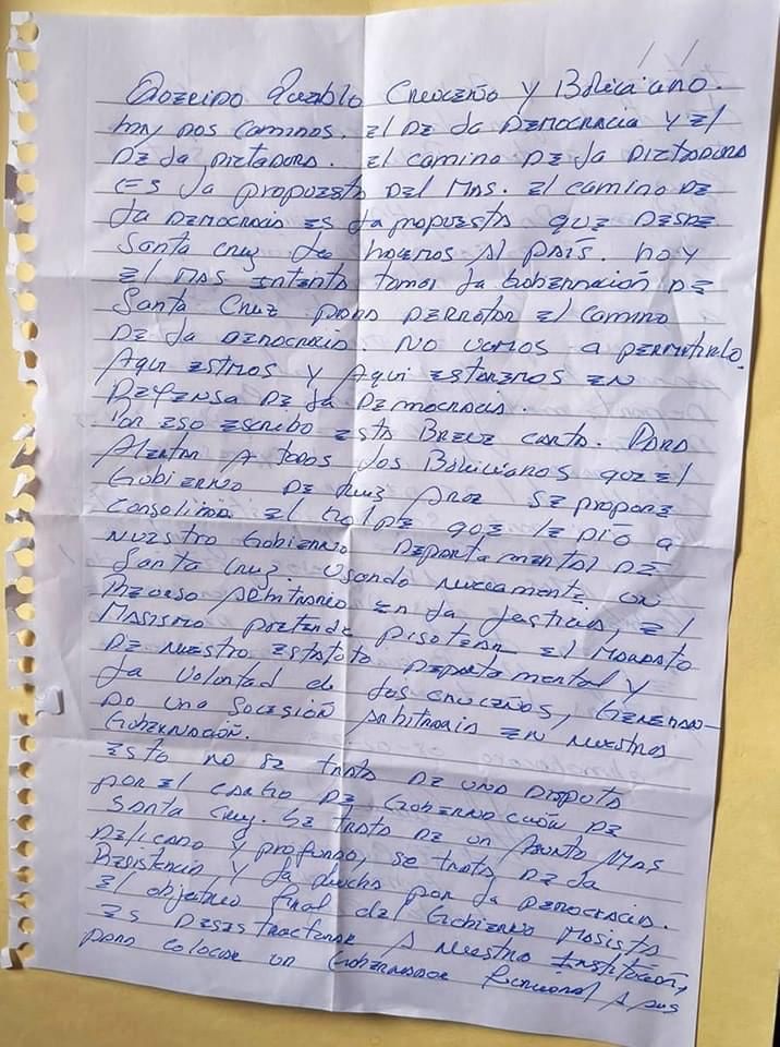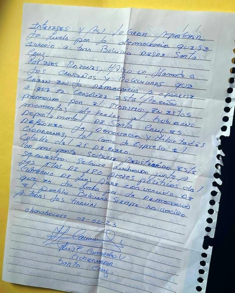 «El objetivo final del gobierno masista es desestructurar a nuestra institución, para colocar un Gobernador funcional a sus intereses y así lograr apagar la lucha por la democracia que se irradia a toda Bolivia desde Santa Cruz», dice parte de la carta del Gobernador secuestrado, Luis Fernando Camacho.