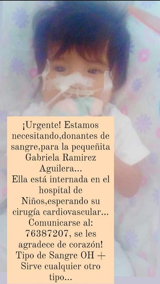 La pequeña Gabriela necesita nuestra ayuda, con suma urgencia necesitan sangre del tipo OH+ para ser operada de emergencia, esta internada en el Hospital de niños.